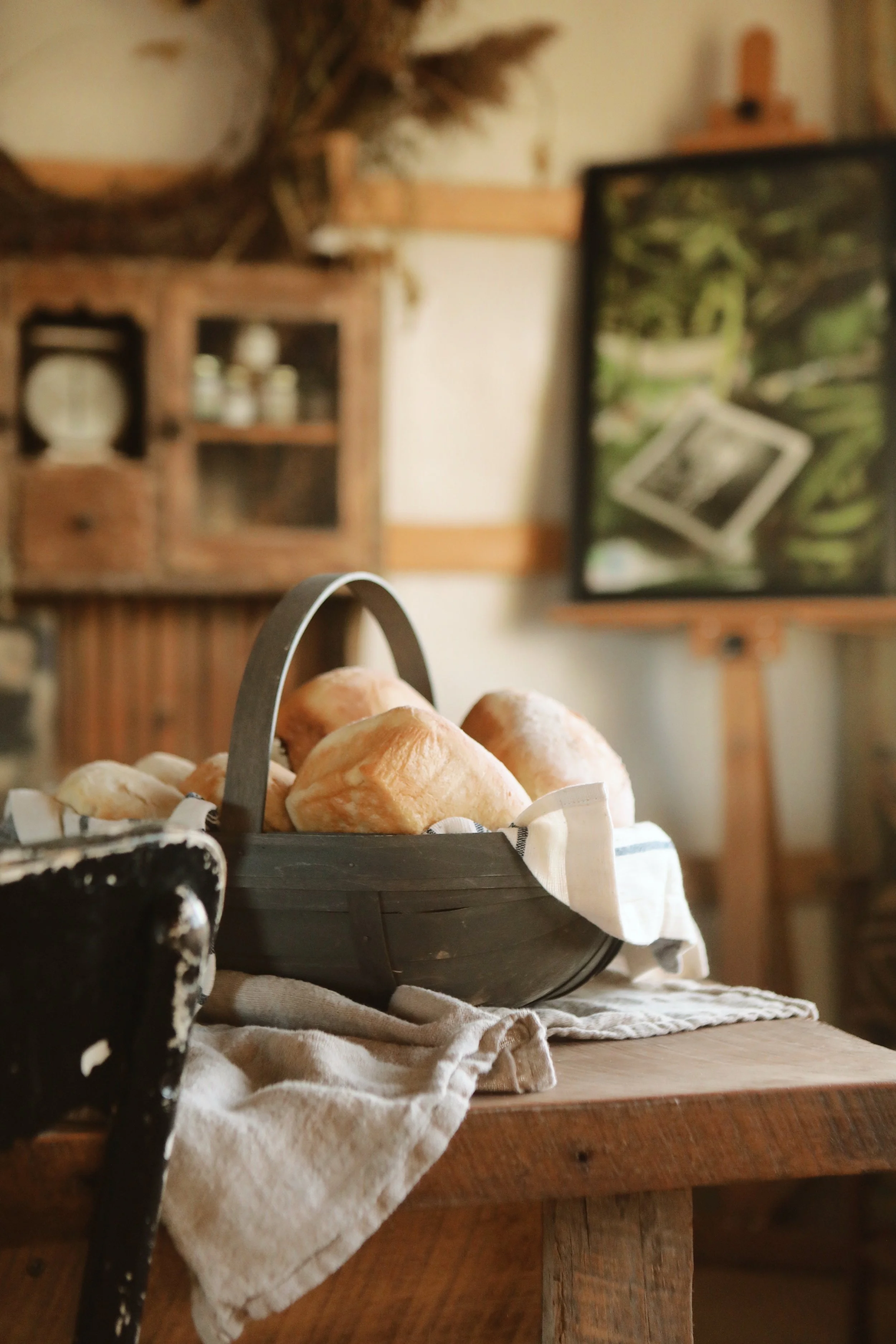 The home is a Federal style wood structure like how they built in New England. Brian and Gina still have many of the original windows and floors. A son of the original owners won a gold medal at the World’s Fair in Chicago for his invention of the Maple Syrup Evaporator. They used the syrup as a sweeter as sugar was costly at the time. There were six barns on the property originally and now the Bishops are down to one just behind the house. Over the years Gina has frequently hosted barn sales in the barn. As the smallest barn on the original property it was likely to have been used for carriages. The barn is at least 100 years old and it’s petite size and charm have been the perfect space for Gina to create in.