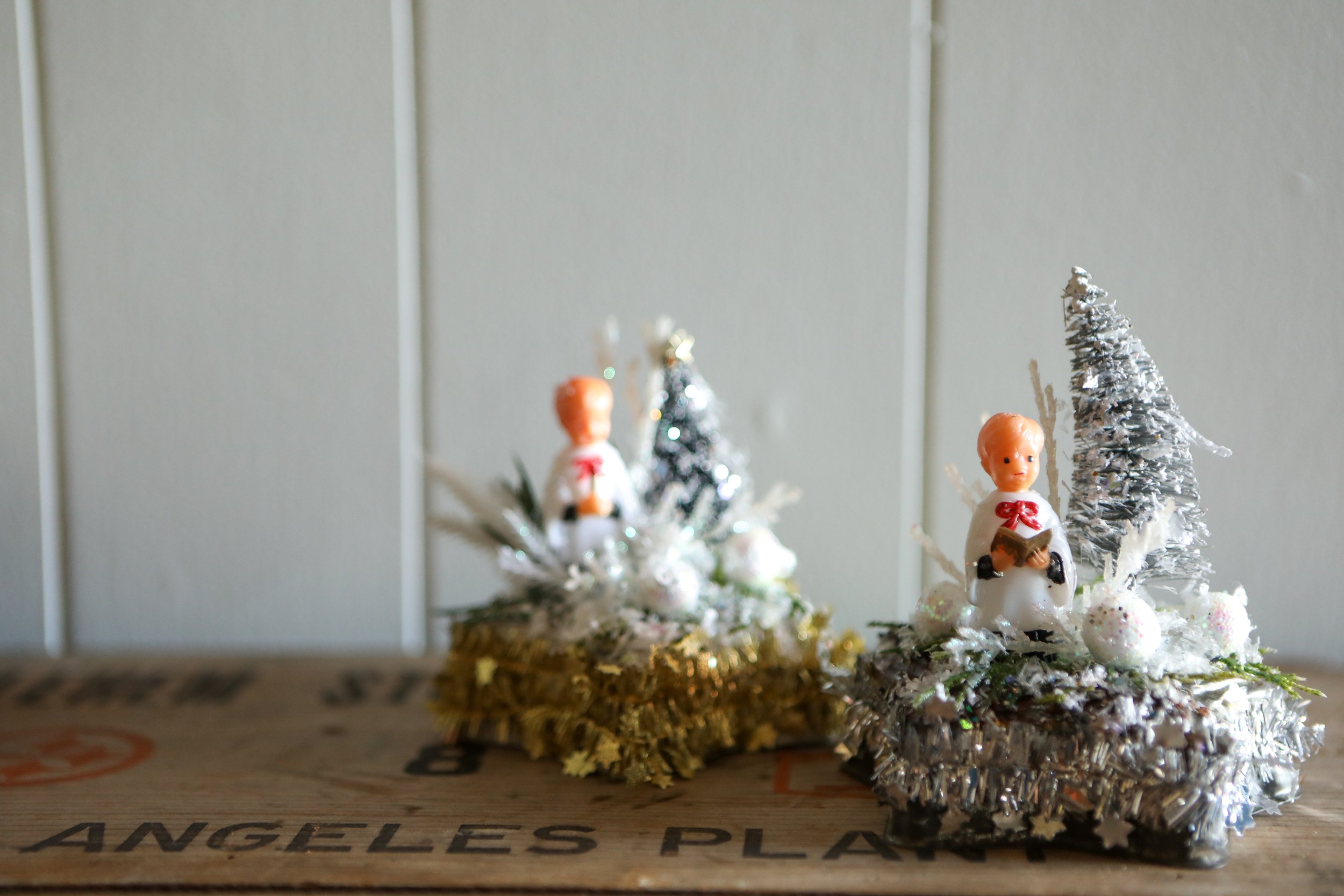 Indeed, her studio reflects the North Pole as she merrily combines textures and objects creating a crop of new holiday décor that simply suits the season’s folly and joy. Among her favorite techniques are marrying disparate castoffs in color to tell a new story. In her able hands and with a dose of festive imagination, an oddball 1950s paper house might meet up with a lonely reindeer and become something more fitting in a frenzy of mica-drenched snow. Likewise, a wayward elf finds a new home among vintage bottle-brush trees and wee tarnished bells. Her pieces each tell a story of Christmas past with a nod to the freshness of recycling and renewed crafting traditions.