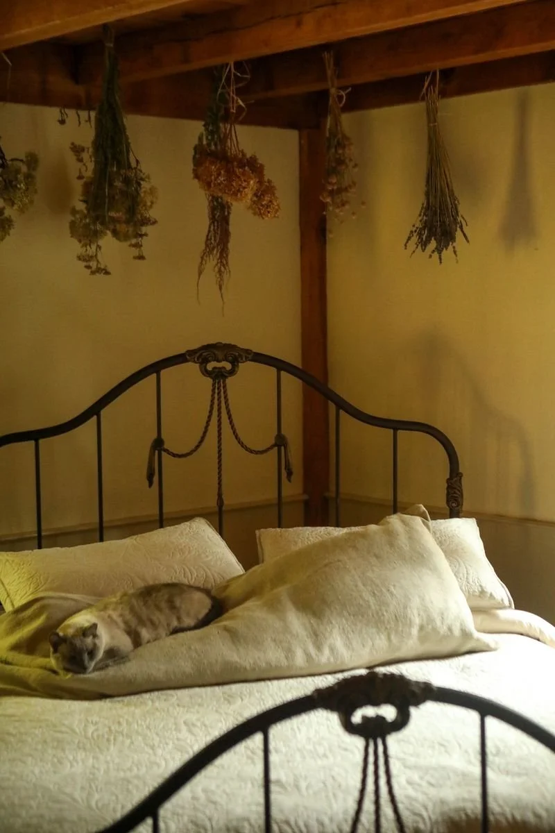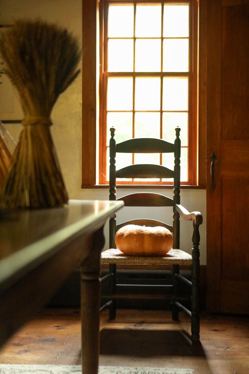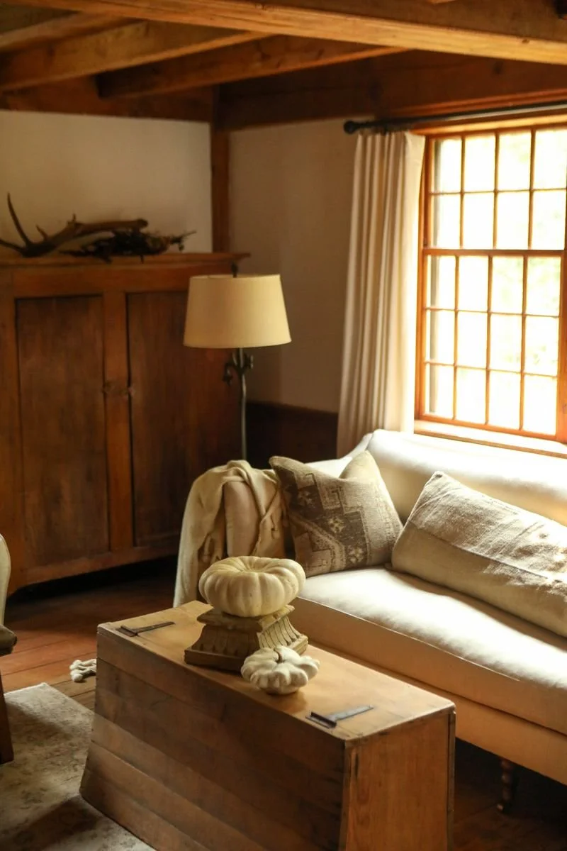 “The interior spaces of our house are a reflection of the serenity of the outdoors, its changing seasons, with a nod to historical interpretation. A calm color palette along with lots of texture keep a balance of peacefulness while being interesting. Light elements balance the darkness of wood, which has aged patina. The original owner rightfully boasts that there is not a single brushstroke of poly anything on the wood in the house. The presence of imperfection fits perfectly with the hand crafted history of our desire to make things rather than buy them. There are hints of a frustrated dog wanting into a space, claw graffiti and the most touching growth chart on an upright post, which we hope to carry on.”