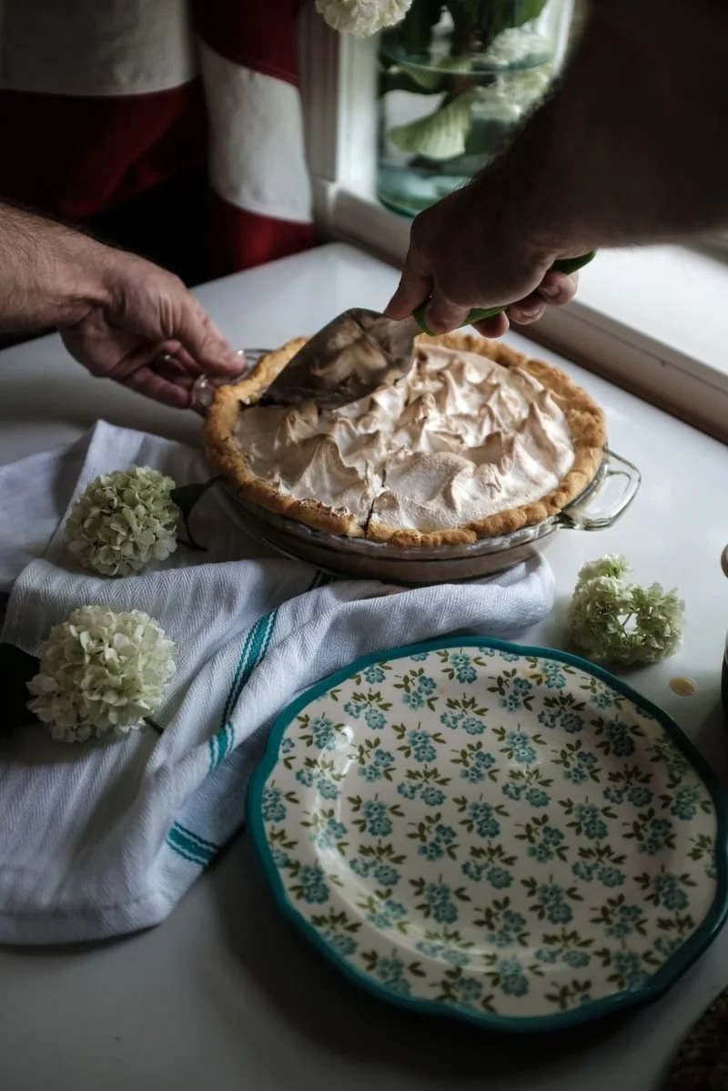 Spoon the meringue over the warm filling, spreading all the way to the edges to seal the crust. Swirl the top with the back of a spoon like little clouds caught mid-drift.